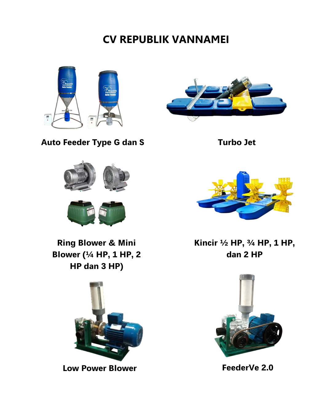 Auto Feeder Type G dan S | Turbo Jet | Ring Blower & Mini Blower (¼ HP, 1 HP, 2 HP dan 3 HP) | Kincir ½ HP, ¾ HP, 1 HP, dan 2 HP | Super Charger (Couple/Pully) | Amr 500 1 HP, 2 HP, dan 3 HP | Amr 1500 3 HP, 4 HP, dan 5 HP
