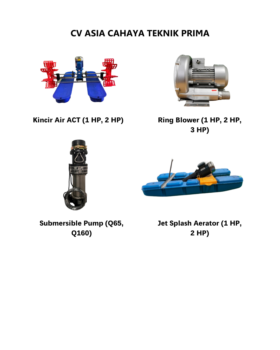 Kincir Air ACT (1 HP, 2 HP) | Ring Blower (1 HP, 2 HP, 3 HP) | Submersible Pump (Q65, Q160) | Jet Splash Aerator (1 HP, 2 HP) |